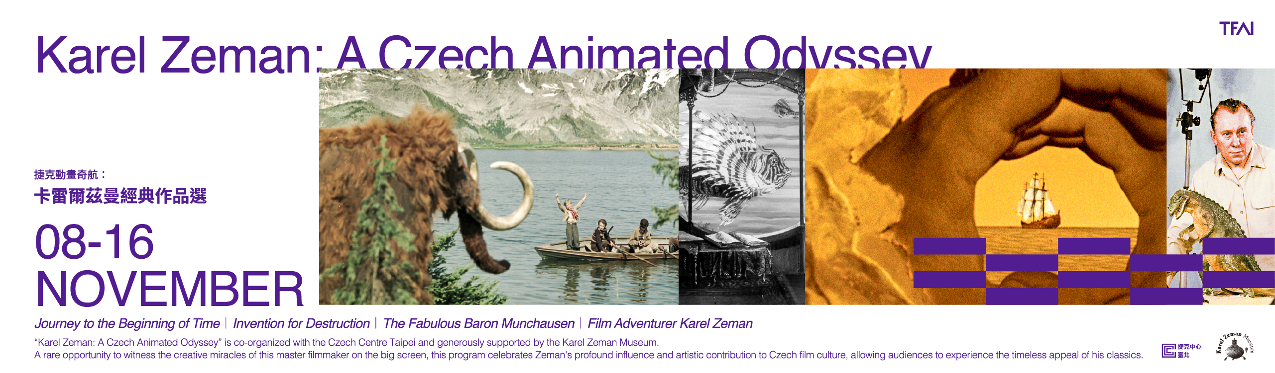 “Karel Zeman: A Czech Animated Odyssey” is co-organized with the Czech Centre Taipei and generously supported by the Karel Zeman Museum. A rare opportunity to witness the creative miracles of this master filmmaker on the big screen, this program celebrates Zeman's profound influence and artistic contribution to Czech film culture, allowing audiences to experience the timeless appeal of his classics.