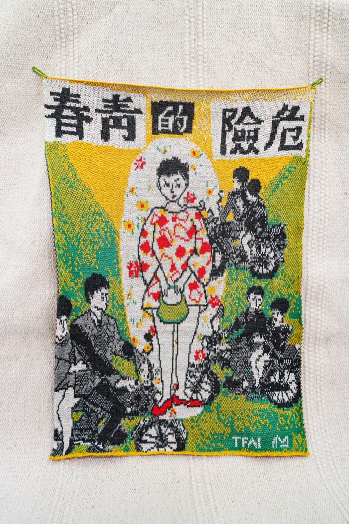 「這是我重新設計的《危險的青春》海報,我沿用片頭的字體,但將重點放在邊移動邊旋轉的雙載魁元機車上,象徵晴美混亂的思緒,而站在中央是準備離家出走的晴美,穿著剛做好的漂亮洋裝,手提著綠色皮包,不知道自己的未來該何去何從?」