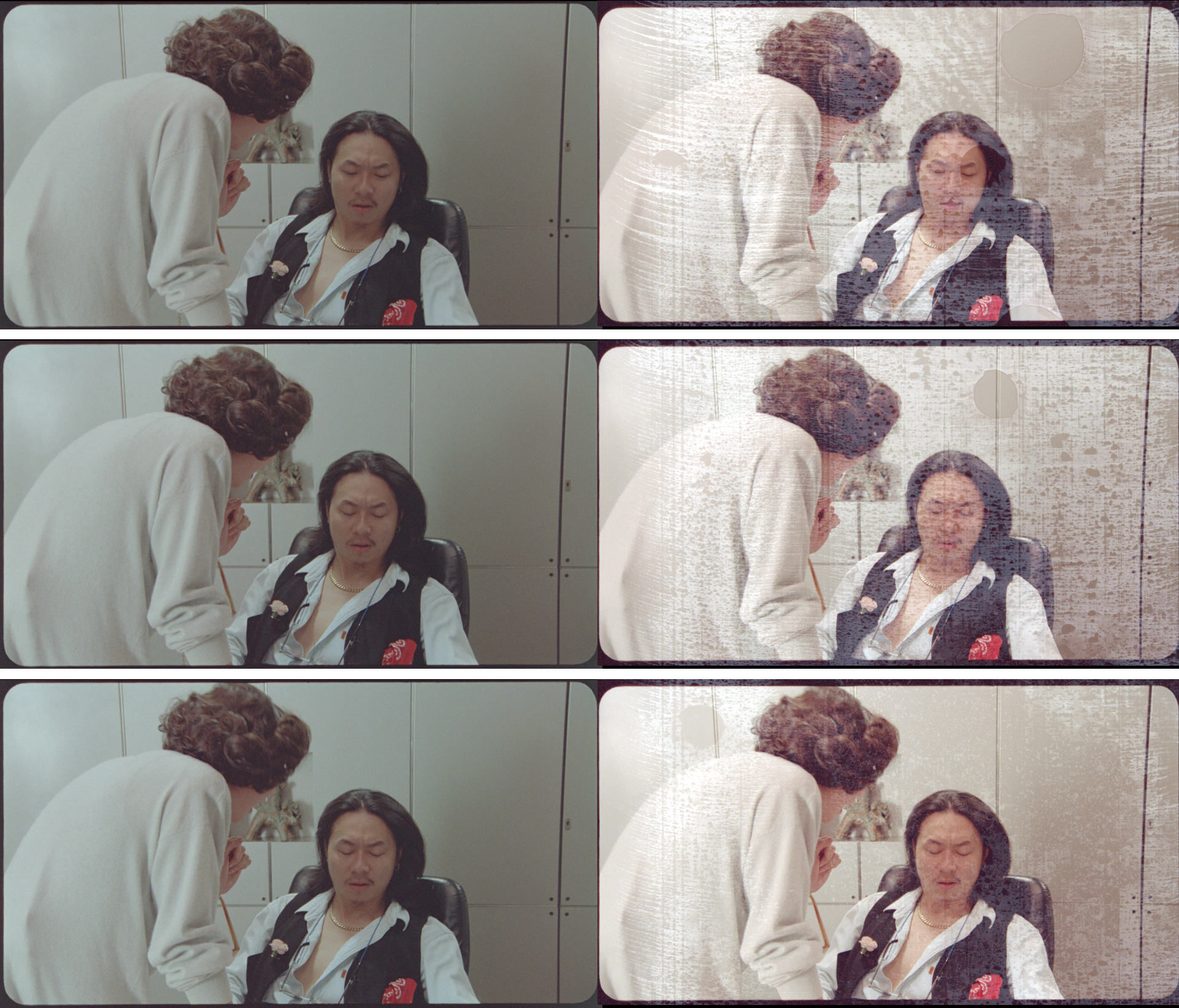 ▲《獨立時代》數位修復前後對照,左方為修復後正片,右方為原底片,可明顯見到水痕覆蓋畫面