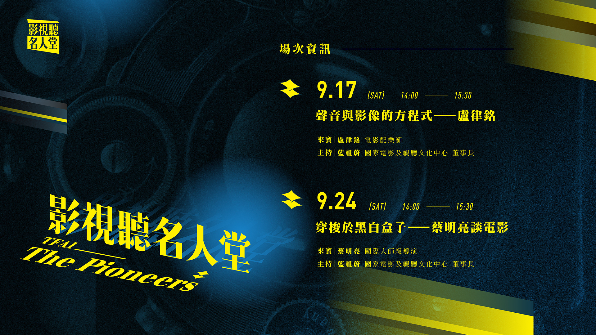 影視聽中心常態講座,邀訪電影、電視、廣播界家喻戶曉的大明星及專業從業人員,由主持人藍祖蔚進行深度對談,分享他們幕前幕後的精彩故事,為我們的時代留下珍貴記憶。9月份邀請電影配樂師盧律銘對談主題「聲音與影像的方程式」,蔡明亮對談電影主題「穿梭於黑白盒子」,歡迎喜愛了解影人深度對談的影痴報名聽講。