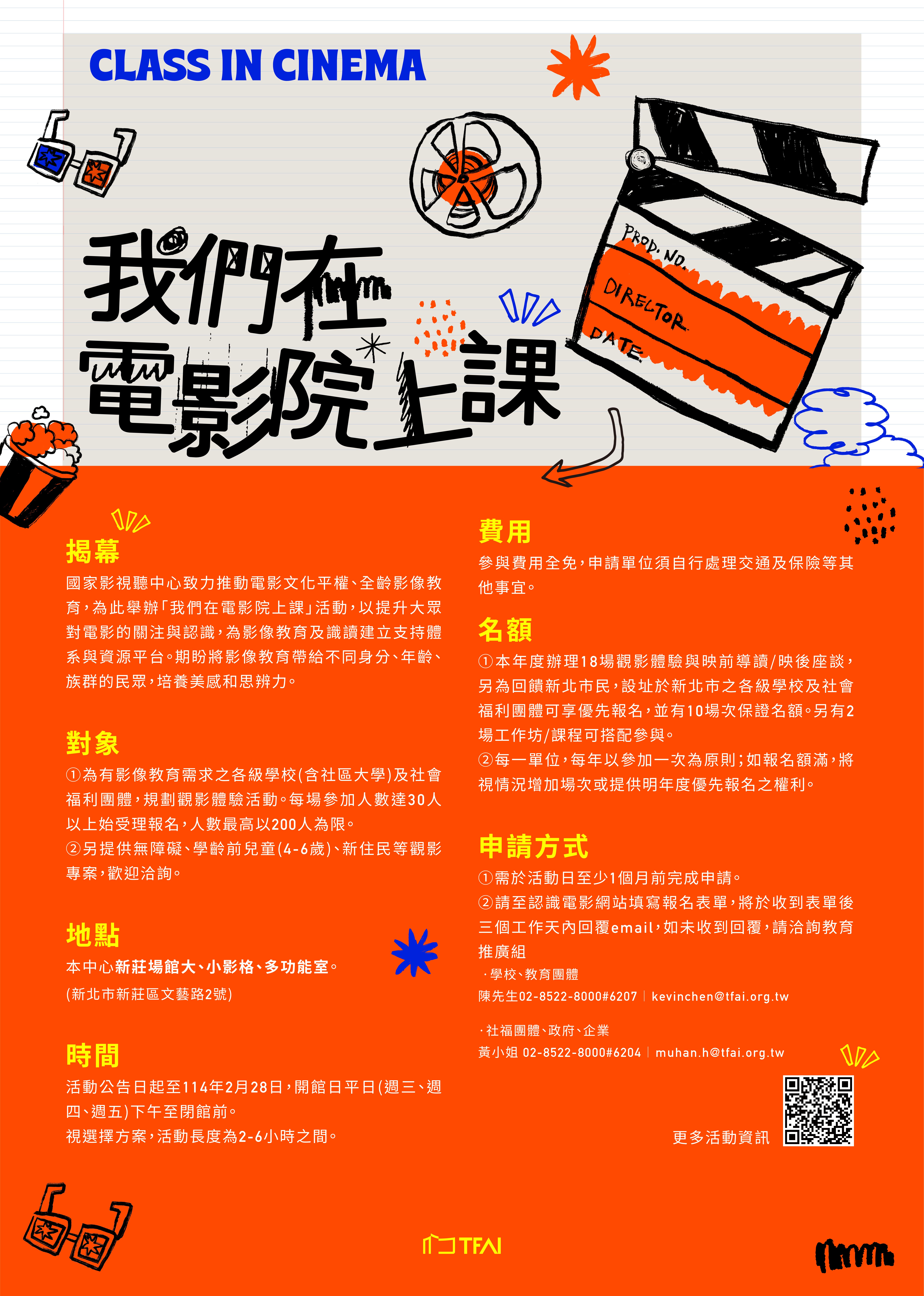 國家影視聽中心致力推動電影文化平權、全齡影像教育,為此舉辦「我們在電影院上課」活動,以提升大眾對電影的關注與認識,為影像教育及識讀建立支持體系與資源平台。期盼將影像教育帶給不同身分、年齡、族群的民眾,培養美感和思辨力。