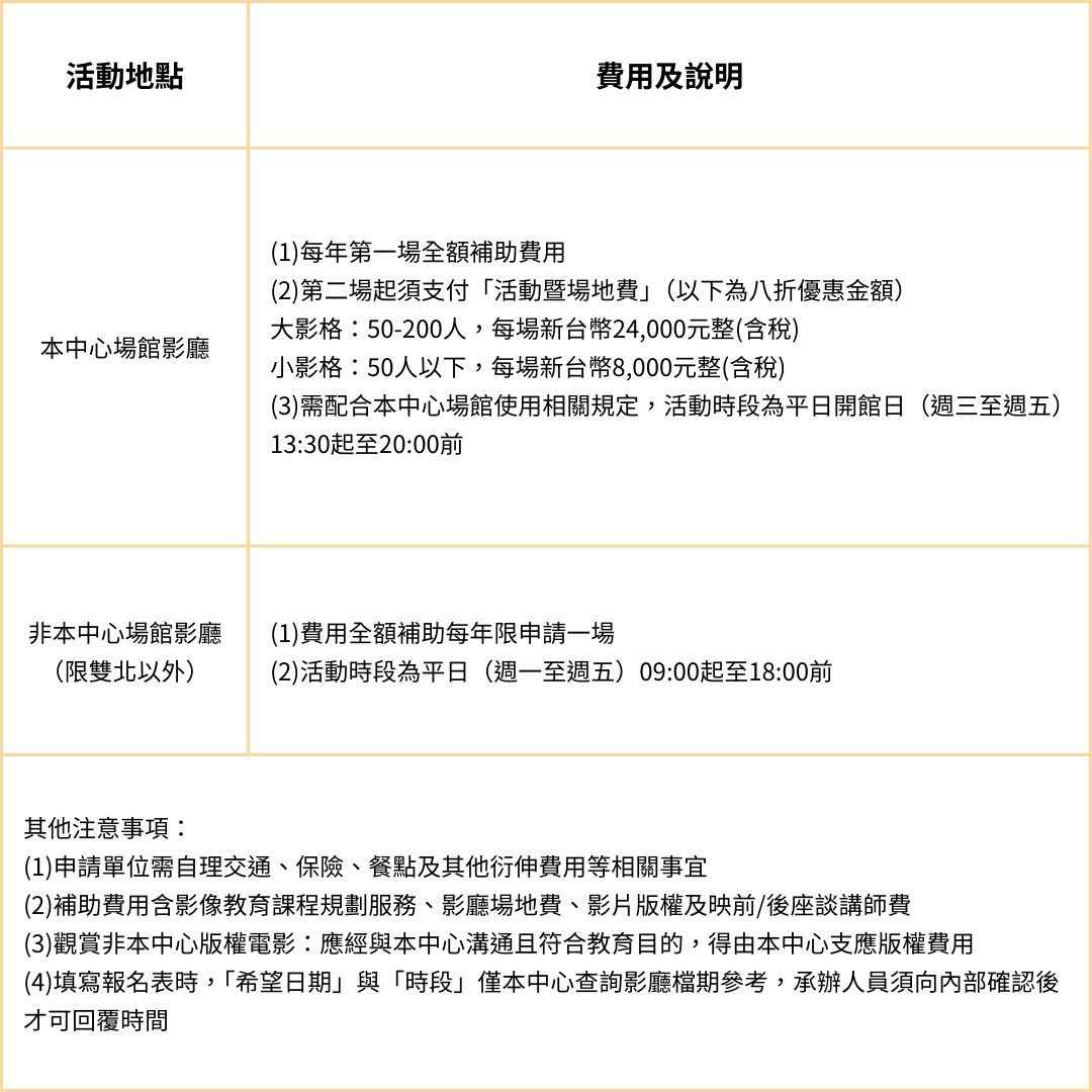一、補助資格:具影像教育需求之非營利教育機構(含各級學校、社區大學、自學團體等,但不包含長短期補習班)及社會福利團體(依台財稅字第09704740870號之認定)。另提供學齡前兒童(4-6歲)、弱勢、新住民、非山非市及偏鄉學校等團體觀影專案,相關細節請洽承辦人員。
