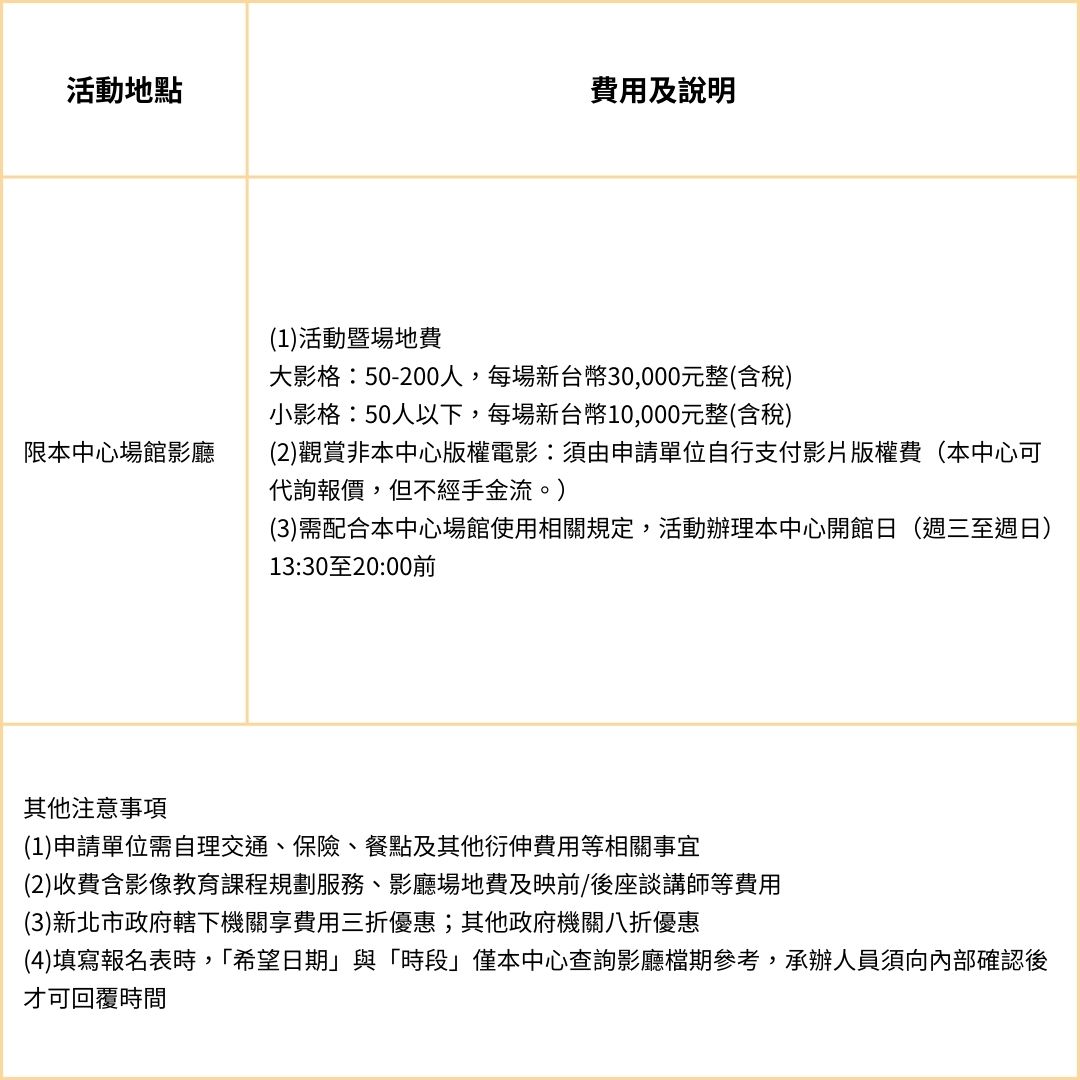 二、付費申請:企業、一般團體及政府機關提供付費包場方案。