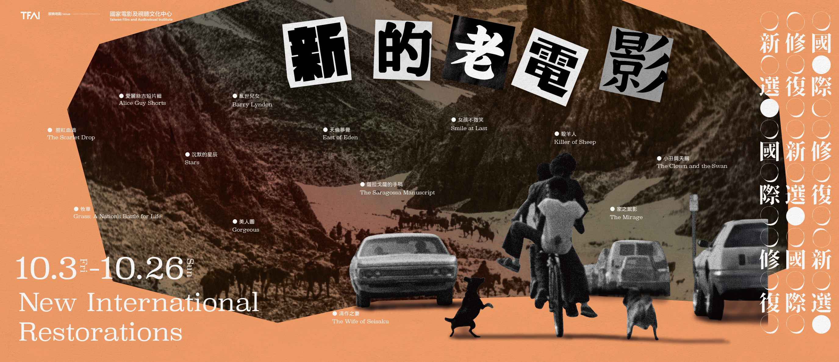 老電影的每一次重映,都能在不同時空語境中啟發洞見、折射新義。那些曾遭禁絕、漠視、棄毀的珍貴影像,在全球資料館與影音修復機構的戮力照護下,歷經數十載仍能躍上大銀幕,與當代觀眾展開光影對話。它們不只是僵死的化石,反而更像一道道被重燃的火花,照亮當下、映射未來,與時代記憶激盪、匯聚成流轉的璀璨星圖。國家影視聽中心第二度策劃「新的老電影」專題,從坎城、柏林、波隆那等影展盛會,蒐羅台灣鮮少放映的影史寶藏,以及影視聽中心甫修復的本土佳作,讓各國大師名作、罕見瑰寶齊聚一堂,在大銀幕上共綻光芒。 今年片單跨度長達八十年:從默片啟程,見證電影濫觴之際女導演跨足不同類型的游刃有餘,及西部片巨匠傑作佚失逾百年後重生的奇蹟;再隨百年前的紀錄片團隊攀越荒山險境,捕捉西亞少數民族的浩蕩遷徙;走入五〇年代好萊塢,詹姆斯狄恩出道時的盛世美顏和叛逆魅力驚豔銀幕;七〇年代庫柏力克蕩氣迴腸的《亂世兒女》,則在半世紀後以4K修復之姿再現殿堂級風采。東歐鐵幕後的作者風格更百花齊放:東德《沉默的星辰》溫柔反思納粹創傷;波蘭奇幻史詩《薩拉戈薩的手稿》構築詭麗的敘事迷官;愛沙尼亞《女孩不微笑》細膩勾勒蘇聯體制下的青春殘酷物語……,在在顛覆共產國家只拍主旋律樣板的刻板印象。回歸亞洲版圖,六〇年代日本戰後大師增村保造訴說驚世駭俗的奇情悲歌;八〇年代印度東部城邦的三代家庭劇,竟與台灣新電影內斂的鄉土情感遙相呼應;而《小丑與天鵝》、《美人圖》兩部與新電影高峰同期的商業作品,則展現出作者電影脈絡之外的喧鬧台片魅力。老片不死,只是重生。無論是初次邂逅或久別重逢,人世間所有與老電影的相遇,都是歷久彌新的不散記憶。 節目勘誤及異動公告 【級別更動】2025/10/02 更新 • 《愛麗絲吉短片輯+腥紅血滴》原普遍級,修正為保護級。 • 《薩拉戈薩的手稿》原保護級,修正為輔12級。 • 《女孩不微笑》原保護級,修正為輔12級。 • 《小丑與天鵝》原保護級,修正為輔12級。 • 《美人圖》原保護級,修正為輔12級。 • 《美的秘聞》原保護級,修正為輔12級。 • 《情婦》原限制級,修正為輔15級。 -