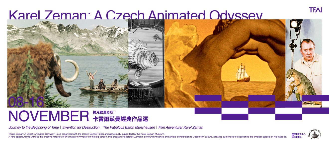卡雷爾茲曼(Karel Zeman)是捷克動畫與電影的開創先驅,他以天馬行空的想像力與獨樹一幟的視覺風格,結合真人拍攝、動畫、定格與特效,創造出一個又一個奇幻冒險的銀幕宇宙,徹底顛覆了傳統動畫與實景拍攝的界線。茲曼的作品展現一種來自手工電影的純粹詩意:紙板、拼貼、定格動畫與精細設計的布景,不僅是技術的實驗,更是對想像力的禮讚。極具匠心的創作除了拓展了電影的語言,更啟發了全球無數電影人與動畫師,其影響力跨越國界與世代,並成功將捷克電影推向國際舞台。 「捷克動畫奇航:卡雷爾茲曼經典作品選」與捷克中心臺北合辦,並獲卡雷爾茲曼博物館(Karel Zeman Museum)鼎力支持,以弘揚茲曼對捷克電影文化的深厚影響與藝術貢獻。本次放映精選的經典之作皆經數位修復,讓觀眾將得以重返那個將科學幻想、童話與藝術交織的異想世界,見證其影像魔法跨越時空的恒久魅力。 合辦:捷克中心臺北 Czech Centre Taipei 鳴謝:卡雷爾茲曼博物館 Karel Zeman Museum -