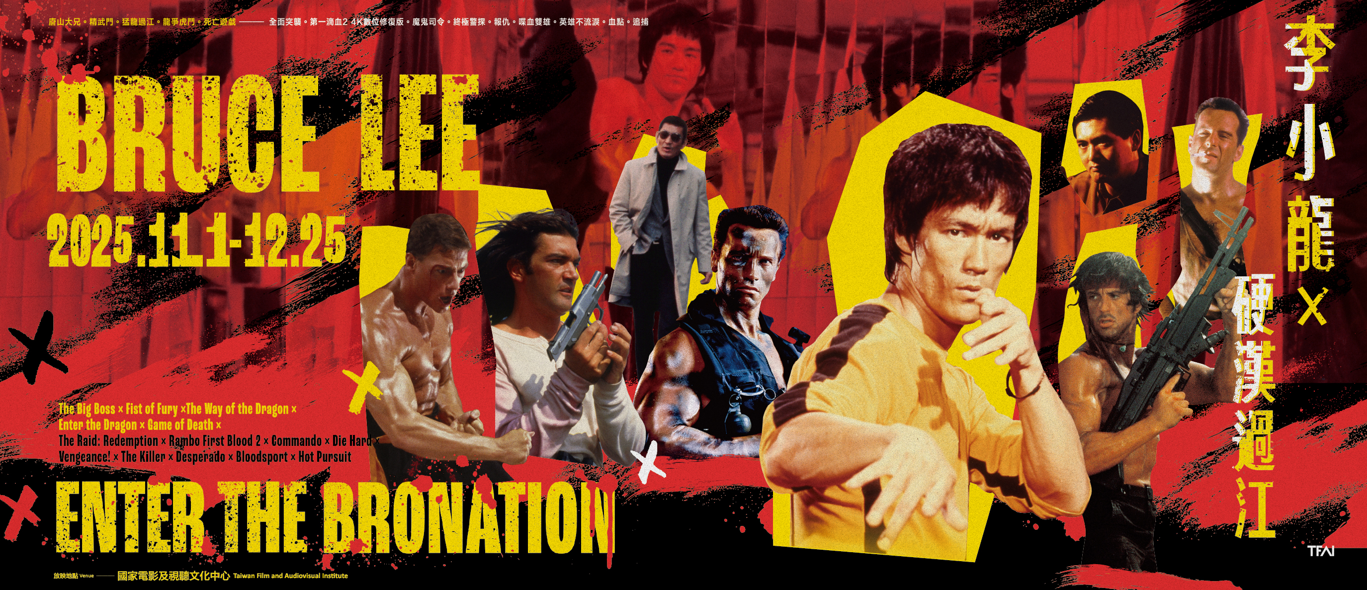 「我,李小龍,將會成為第一個美國片酬最高的東方超級巨星。作為回報,我將以自己身為演員的能力,給予觀眾最刺激、最高品質的表演。」—— 李小龍 宛如銅牆鐵壁般的功夫之神,重新定義了陽剛性。隨著被脫去的上衣一起解放,肌肉和出手前嚎叫成為新的陽剛符號。一記飛踢橫空出世,他將戲外赤手空拳的苦練延伸至戲中,發展出毫不拖泥帶水的打鬥模式。極具銀幕魅力的動作語言,激發觀眾對男子氣概新的想像與崇拜,這種具寫實又強大的武術英雄,燃起社會新的使命感,從香港、亞洲一路跨洋到歐美,全世界都想效仿這位來自亞洲強悍無比的武術大師。 李小龍化身為繆思,世界電影擁抱了他所創造的硬漢銀幕形象,在那之後一個比一個更不好惹的英雄陸續降臨,好萊塢更將李小龍那股「一個人也能打到底」的精神發揚光大。仔細一看,無論是叢林裡爆炸的藍波、一人滅一國的魔鬼司令阿諾,還是劈腿劈進秘密搏擊大賽的范達美,其實都像是李小龍的遠房美國表親。硬漢們堅持同樣的鐵血信仰:不達目的不罷休。男人堅持不懈的意志力與出招前的帥氣POSE,由姜大衛的復仇之路、殺手周潤發打不完的子彈、含冤逃亡的高倉健和沒有回頭路的菜鳥警察拉瑪,各自以速度、爆發力與沉默展現致命氣場。但英雄也是會流淚,警探麥克連情場失意職場也不如意,以及浪子埃爾馬里亞奇在拉丁音樂中的情感拉扯,都流露出鐵漢的脆弱情感,卻使平凡人們獲得自信與力量,原來小人物也能被激發出單挑恐怖份子的潛力。所以生活雖然依舊一塌糊塗,但沒關係,沒有什麼事是硬漢們一個拳頭不能解決的;一個拳頭不能解決就用兩個。 電影院正在上映今年最新的動作片電影,但我們仍然在這個追求新鮮感的年代不厭其煩的複習經典。當年的英雄們不需要超能力,就能在兩個小時內用勇氣和肌肉秀給予安全感。也許渺小的我們無時無刻都需要李小龍和硬漢大叔提醒永不放棄、永不失敗,和永不放開拳頭的力量;總之真慶幸他們的到來。現在回味的時刻又到了,以李小龍為首集結影史14部經典硬漢電影,將在影視聽中心展開一場大銀幕上的超MAN終極搏鬥。 節目勘誤及異動公告 【11月ON國家影視聽中心月訊勘誤】2025/10/29 更新 • p.7 場次表,11月2日的《死亡遊戲》片長,應修正為「90」。 • p.20 《死亡遊戲》片長,應修正為「90」。 【級別更動】2025/10/30 更新 • 《唐山大兄》原限制級,修正為輔15級。 • 《精武門》原輔12級,修正為輔15級。 • 《龍爭虎鬥》原輔12級,修正為輔15級。 • 《死亡遊戲》原輔12級,修正為輔15級。 • 《報仇》原限制級,修正為輔15級。 • 《血點》原12級,修正為輔15級。 -