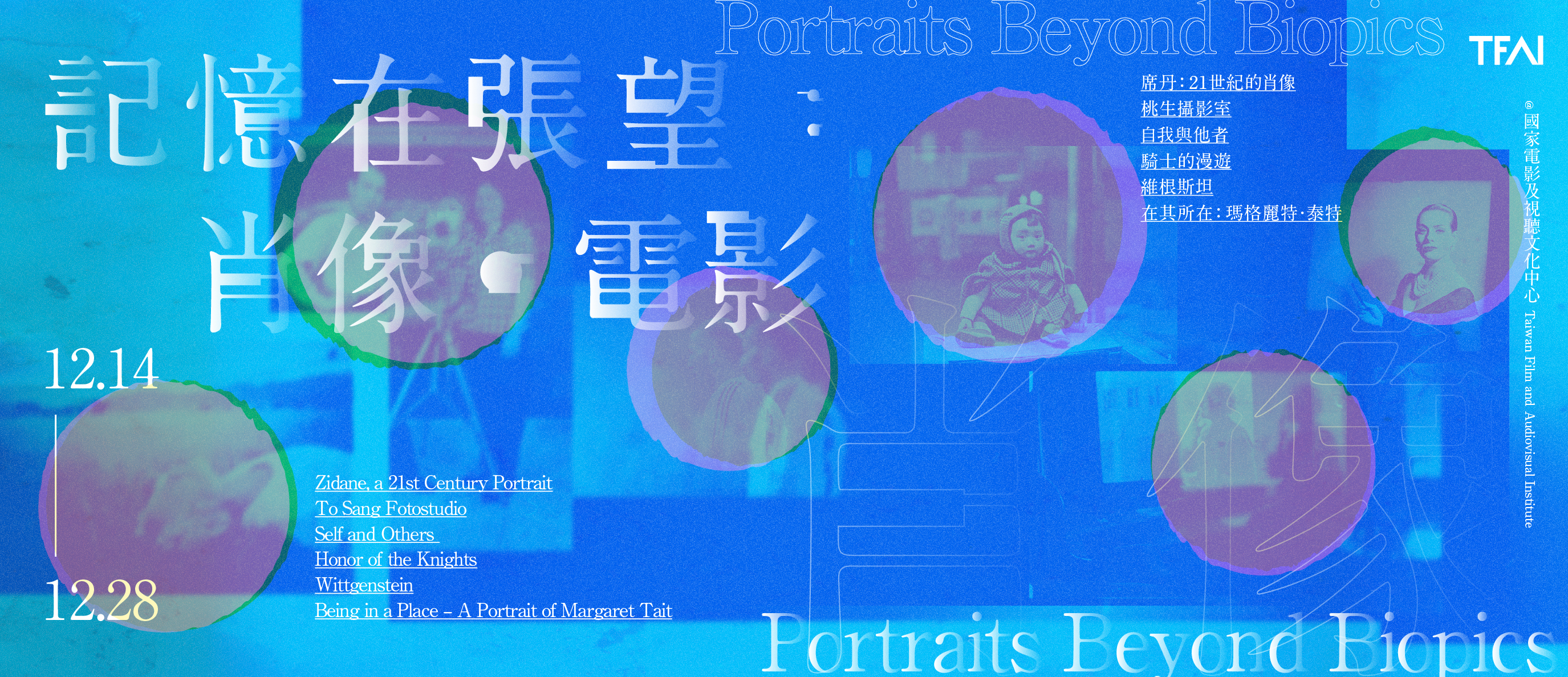 集結六部以「人物」為題的作品,卻非傳統意義上的傳記,不以生平編年或情節推進敘事, 而是以「肖像」為概念對人物進行側寫描繪,並以不同方向擴展此命題,追問:在電影的時間性之中,一個人可以如何被呈現? 作品中的肖像不再是既定的樣貌,而是一場持續進行的協商:拍攝者的取捨、被攝者的自我呈現、媒介的規則與慣例,以及場所的氣息,共同決定了影像如何被生成、被觀看、被理解。 《席丹:21世紀的肖像》把一場比賽化為凝視的實驗,在席丹喘息、專注與閃神之間,顯影出一代傳奇的另種模樣。《騎士的漫遊》在幾近失語的漫遊與光影中,不見英雄旅程,只見與風、地景、時間同處的騎士身影。《維根斯坦》利用舞台、黑幕、機智對話與重演,將哲學偶像拆解為語言與欲望的喜劇肖像。 《自我與他者》以牛腸茂雄的攝影作品、錄音、信件,讓人物影像的「不在」與聲音的「在場」相互對映,邀請觀者在時間的縫隙裡與他者(或自我)面對面。《桃生攝影室》拍攝阿姆斯特丹街區的一間照相館,呈現攝影師李桃生如何與多族群的客人互動,共同協商一張理想的肖像,也勾勒出一幅集體的移民群像。 最後,《在其所在:瑪格麗特.泰特》從電影詩人泰特未竟的拍攝計畫出發,藉由檔案、聲響與風景的拼貼,回應她的「電影-詩」。 由此,每個肖像都成了匯流之處:被攝者的生命痕跡、拍攝者的視覺經驗、影像媒介自身的物質與歷史沉積,以及觀者帶來的感知與想像,於同一個身影上層層交疊。肖像也因此成了多層記憶疊映到此刻的觀看現場:生命記憶、視覺記憶、媒介記憶,以及文化記憶,在當下彼此折射、改寫。 於是,「人」不再被簡單重述,而是在多重目光的張望之中,重新遇見。 -