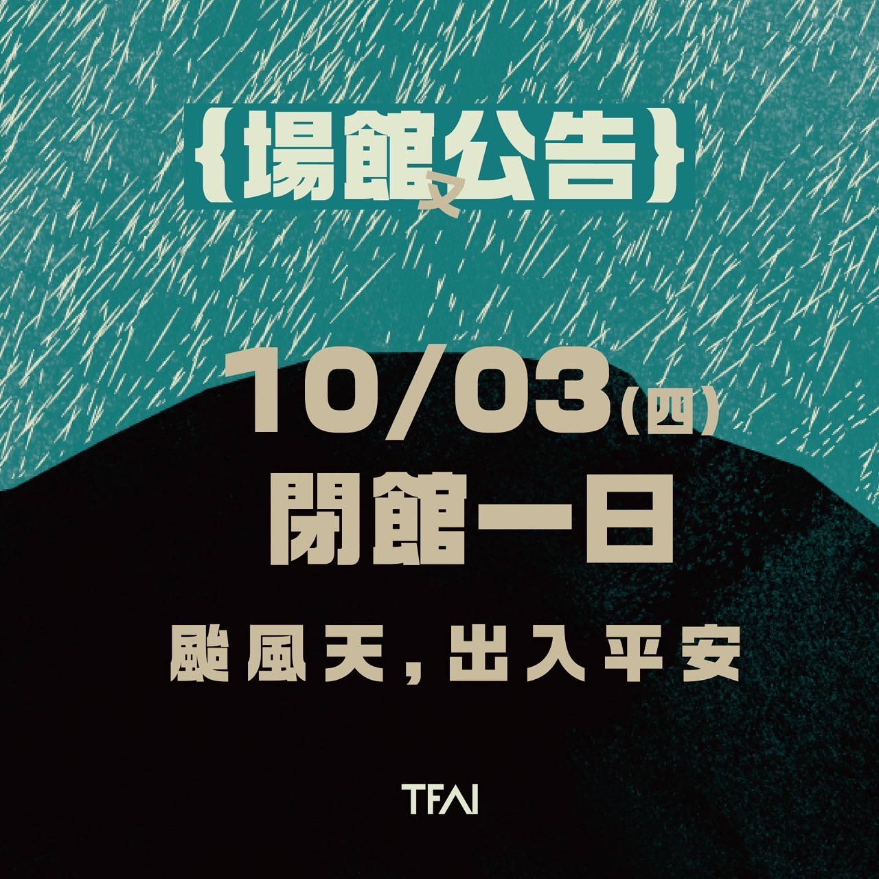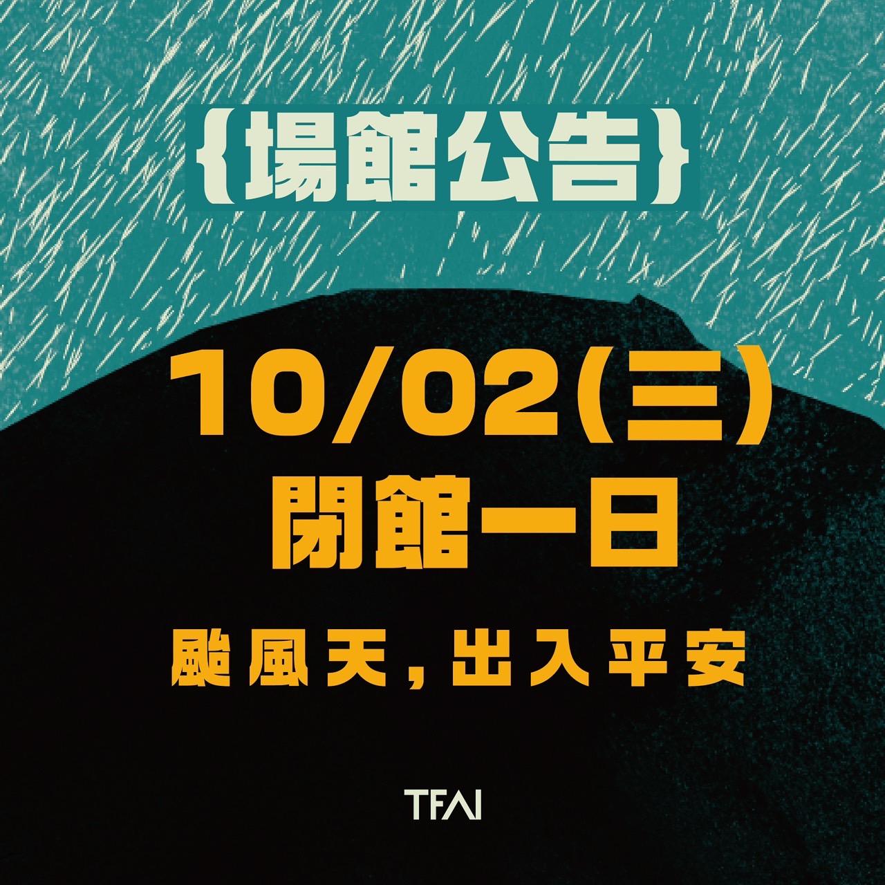 因<山陀兒>颱風來襲,本中心所在區域之新北市政府,宣布各機關停止上班,國家電影及視聽文化中心場館全區(含公共區域、影廳、圖書館及地下停車場)10/2(三) - 10/3(四) 閉館。